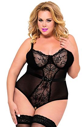 Otwarte body w kolorze czarnym plus size Amelia wykonane z delikatnego i niezwykle miękkiego tiulu. Usztywniane miseczki pięknie eksponują biust. Model posiada regulowane ramiączka oraz ozdobną satynową tasiemkę wiązaną z tyłu. Body zdobione finezyjną koronką. Całość dopełnia seksowne wycięcie w kroku.